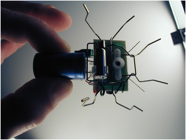Recycled pager motor, solar panel, and electronics based on a circuit designed by Mark Tilden of Los Alamos National Laboratories.